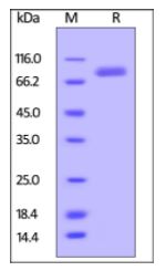 | Molecular Mass : | The protein has a calculated MW of 67.8 kDa. The protein migrates as 70-100 kDa under reducing (R) condition (SDS-PAGE) due to glycosylation. |