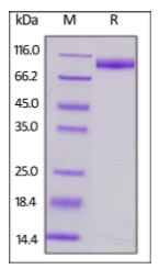 | Molecular Mass : | The protein has a calculated MW of 64.3 kDa. The protein migrates as 90-100 kDa under reducing (R) condition (SDS-PAGE) due to glycosylation. |