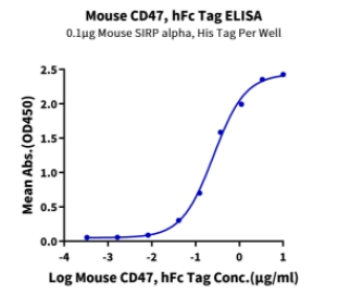 | Bio-activity : | Immobilized Mouse SIRP alpha, His Tag at 1ug/ml (100ul/well) on the plate. Dose response curve for Mouse CD47, hFc Tag with the EC50 of 0.26ug/ml determined by ELISA (QC Test). |