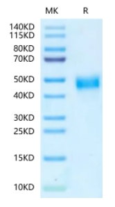 | Molecular Mass : | The protein has a predicted MW of 28.8 kDa. Due to glycosylation, the protein migrates to 48-55 kDa based on Tris-Bis PAGE result. |