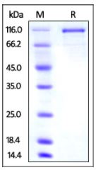 | Molecular Mass : | The protein has a calculated MW of 103.2 kDa. The predicted N-terminus is Ile. The predicted N-terminus is Ile. The reducing (R) protein migrates as 116 kDa in SDS-PAGE due to glycosylation. |