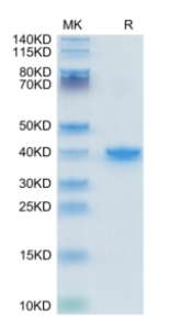 Molecular Mass : | The protein has a predicted MW of 32.9 kDa. Due to glycosylation, the protein migrates to 38-42 kDa based on Tris-Bis PAGE result. |