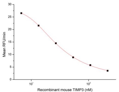 Tissue Inhibitors Of Metalloproteinase 3 (TIMP3) is an protein belongs to the tissue inhibitor of metalloproteinases family. They are inhibitors of the matrix metalloproteinases. TIMP-3 is the only member of the TIMP family which is found exclusively in the extracellular matrix (ECM). It is regulated in a cell cycle-dependent fashion in certain cell types and may serve as a marker for terminal differentiation. The activity of recombinant mouse TIMP3 was measured by its ability to inhibit rhMMP2 cleavage of a fluorogenic peptide substrate MCA-Pro-Leu-Gly-Leu-DPA-Ala-Arg-NH2 in the assay buffer 50 mM Tris, 10 mM CaCl2, 150 mM NaCl, 0.05% (w/v) Brij-35, pH 7.5. rhMMP2 was diluted to 100 ug/ml and activated with 1 mM APMA at 37°C for 1 hour and rmTIMP3 (MW: 23.25 KD) was diluted to different concentrations with the assay buffer. Mix 8 µl of rmTIMP3 curve dilutions, 12.8 µl of activated rhMMP-2, and 59.2 µl of assay buffer, including a control containing assay buffer and the diluted rhMMP-2 and incubate the reactions for 2 hours at 37°C. Loading 50 µl of the incubated mixtures which were diluted five-fold in assay buffer into empty wells of a plate, and start the reaction by adding 50 µl of 20 µM substrate. Include a substrate blank containing 50 µl of assay buffer and 50 µl of 20 µM substrate. Then read at excitiation and emission wavelengths of 320 nm and 405 nm, respectively, in kinetic mode for 5 minutes. The result was shown and it was obvious that recombinant mouse TIMP3 significantly decreased rhMMP2 activity. The inhibition IC50 was <26 nM. |