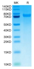 | Molecular Mass : | The protein has a predicted MW of 65.65 kDa. Due to glycosylation, the protein migrates to 70-80 kDa based on Tris-Bis PAGE result. |