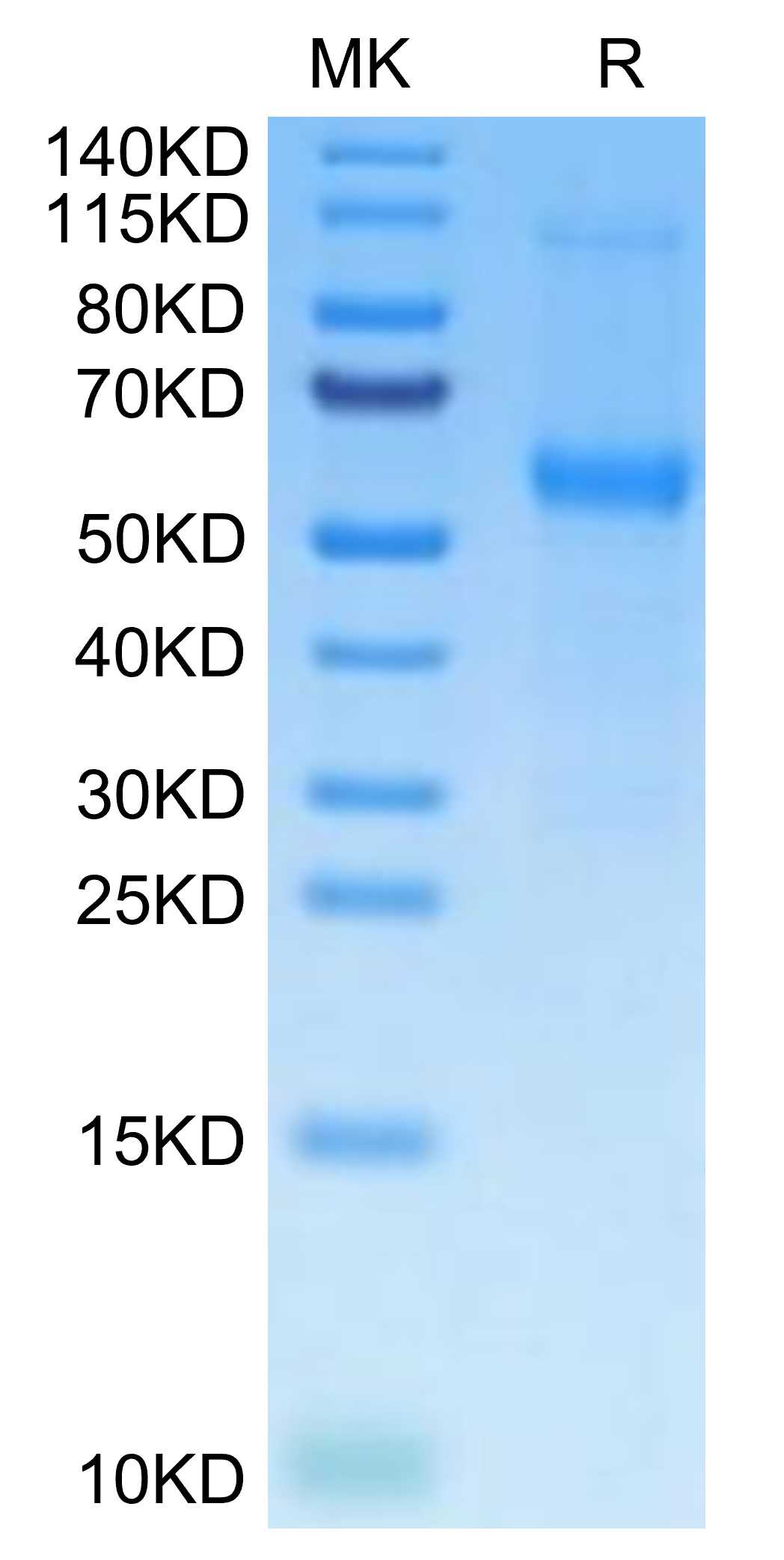 Molecular Mass : | The protein has a predicted MW of 44.53 kDa. Due to glycosylation, the protein migrates to 55-65 kDa based on Tris-Bis PAGE result. |