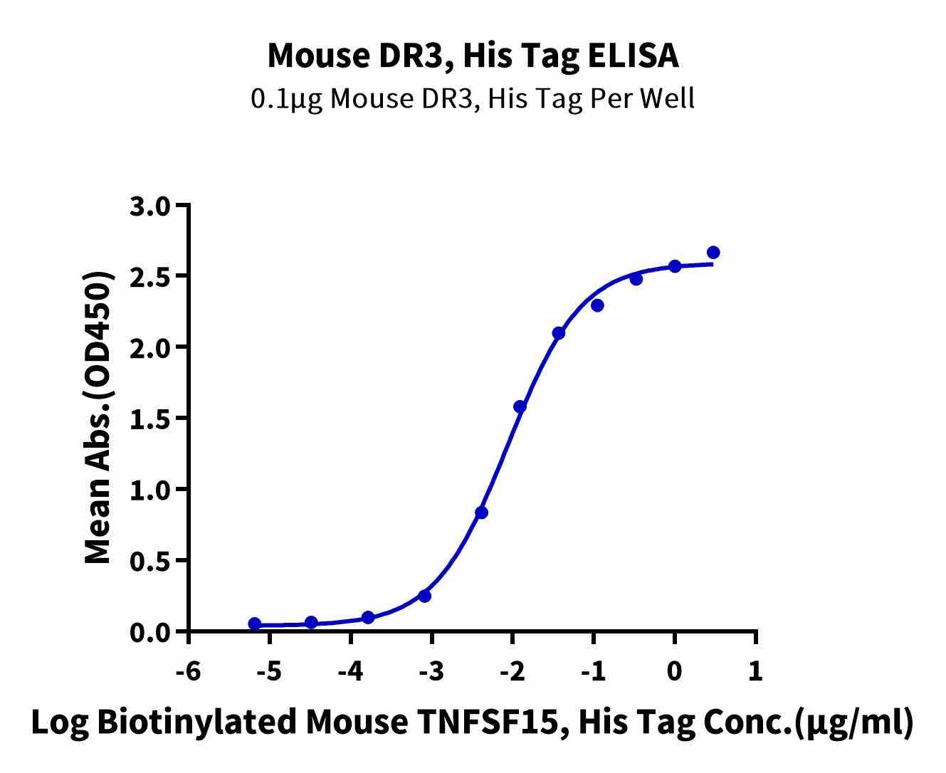 | Bio-activity : | Immobilized Mouse DR3, His Tag at 1μg/ml (100 μl/well) on the plate. Dose response curve for Biotinylated Mouse TNFSF15, His Tag with the EC50 of 8.8 ng/ml determined by ELISA. |