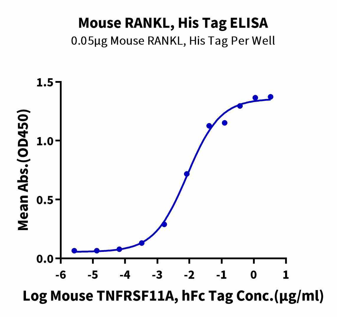 | Bio-activity : | Immobilized Mouse RANKL, His Tag at 0.5μg/ml (100μl/well) on the plate. Dose response curve for Mouse TNFRSF11A, hFc Tag with the EC50 of 8.5ng/ml determined by ELISA. |