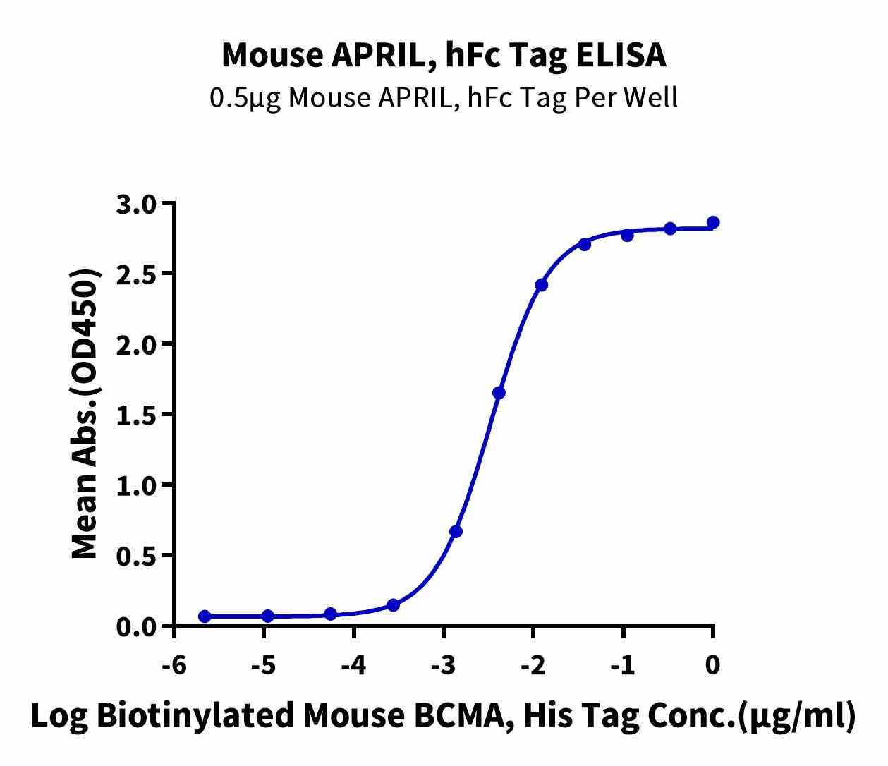 | Bio-activity : | Immobilized Mouse APRIL, hFc Tag at 5μg/ml (100μl/well) on the plate. Dose response curve for Biotinylated Mouse BCMA, His Tag with the EC50 of 3.4ng/ml determined by ELISA. |