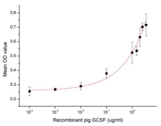 G-CSF is a pleiotropic cytokine best known for its specific effects on the proliferation, differentiation, and activation of hematopoietic cells of the neutrophilic granulocyte lineage. It is produced mainly by monocytes and macrophages upon activation by endotoxin, TNF-alpha and IFN-gamma. In addition, various carcinoma cell lines and myeloblastic leukemia cells can express G-CSF constitutively. In vitro, G-CSF stimulates growth, differentiation and functions of cells from the neutrophil lineage. Consistent with its in vitro functions, G-CSF has been found to play important roles in defense against infection, in inflammation and repair, and in the maintenance of steady state hematopoiesis. The activity of G-CSF is usually measured by a cell proliferation assay using M-NFS60 mouse myelogenous leukemia lymphoblast cells. M-NFS60 cells were seeded into triplicate wells of 96-well plates at a density of 8,000 cells/well with 2% serum standard 1640 which contains various concentrations of recombinant pig G-CSF. After incubated for 4 days, cells were observed by inverted microscope and cell proliferation was measured by Cell Counting Kit-8 (CCK-8). Briefly, 10 µl of CCK-8 solution was added to each well of the plate, then the absorbance at 450 nm was measured using a microplate reader after incubating the plate for 2-4 hours at 37°C. Proliferation of M-NFS-60 cells after incubation with G-CSF for 4 days observed by inverted microscope was shown. Cell viability was assessed by CCK-8 (Cell Counting Kit-8 ) assay after incubation with recombinant pig G-CSF for 4 days. It was obvious that G-CSF significantly increased cell viability of M-NFS-60 cells. The EC50 is 1 ug/ml. |