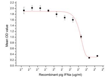 Interferon-alpha (IFNa), also known as leukocyte interferon, represents a group of related but distinct proteins that share over 95% amino acid sequence homology. They are members of the type I interferon family which share a common cell surface receptor composed of two subunits. IFN-α has both anti-viral and immunomodulatory activities on target cells. To test the effect of IFNa on cell apoptosis, A549 cells were seeded into triplicate wells of 96-well plates at a density of 4,000 cells/well and allowed to attach overnight, then the medium was replaced with various concentrations of recombinant pig IFNa diluted with 5% serum standard DMEM. After incubated for 72h, cells were observed by inverted microscope and cell proliferation was measured by Cell Counting Kit-8 (CCK-8). Briefly, 10 µl of CCK-8 solution was added to each well of the plate, then the absorbance at 450 nm was measured using a microplate reader after incubating the plate for 1-4 hours at 37°C. Apoptosis of A549 cells after incubation with IFNa for 72h observed by inverted microscope was shown. Cell viability was assessed by CCK-8 (Cell Counting Kit-8 ) assay after incubation with recombinant IFNa for 72h. It was obvious that IFNa significantly decreased cell viability of A549 cells. The ED50 of recombinant pig IFNa is 9.24 ug/ml. |