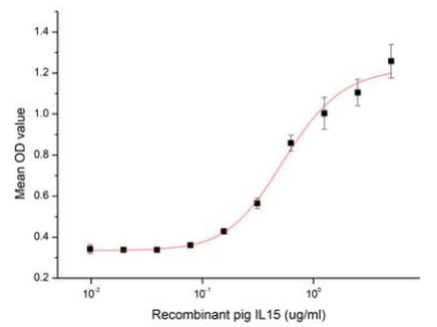 Interleukin 15 (IL15) is a widely expressed cytokine that is structurally and functionally related to IL2, which plays an important role in many immunological diseases. IL15 also regulates T and natural killer (NK) cell activation and proliferation. The activity of recombinant pig IL15 was measured in a cell proliferation assay using MO7e human megakaryocytic leukemic cells. MO7e cells were seeded into triplicate wells of 96-well plates at a density of 30,000 cells/well in RPMI-1640 with the addition of various concentrations of rpIL15. After incubated for 72h, cells were observed by inverted microscope and cell proliferation was measured by Cell Counting Kit-8 (CCK-8). Briefly, 10 µl of CCK-8 solution was added to each well of the plate, then the absorbance at 450 nm was measured using a microplate reader after incubating the plate for 1-4 hours at 37°C. Cell proliferation of MO7e cells after incubation with rpIL15 for 72h observed by inverted microscope was shown. The dose-effect curve of rpIL15 was shown. It was obvious that rpIL15 significantly promoted cell proliferation of MO7e cells .The EC50 for this effect is typically 0.55 ug/ml. |