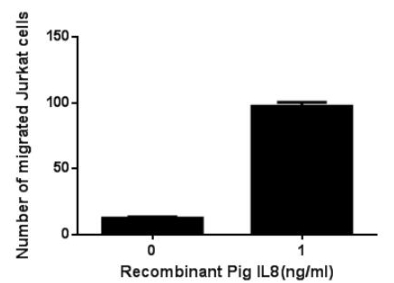 Interleukin 8 (IL8 or chemokine (C-X-C motif) ligand 8, CXCL8) is a chemokine produced by macrophages and other cell types such as epithelial cells, airway smooth muscle cells and endothelial cells.Thus, chemotaxis assay used 24-well microchemotaxis system was undertaken to detect the chemotactic effect of IL8 on the human T-lymphocyte leukemia cell line Jurkat. Briefly, Jurkat cells were seeded into the upper chambers (100ul cell suspension,10^6 cells/ml in RPMI 1640 with FBS free) and recombinant pig IL8 (1ng/ml, 10ng/ml,100ng/ml and 1000ng/ml diluted separately in serum free RPMI 1640 ) was added in lower chamber with a polycarbonate filter(8um pore size) used to separate the two compartments. After incubation at 37°C with 5% CO2 for 1h, the filter was removed,then cells in low chamber were observed by inverted microscope at low magnification (×100) and the number of migrated cells were counted at high magnification(×400) randomly (five fields for each filter). Result shows IL8 is able to induce migration of Jurkat cells. The migrated Jurkat cells in low chamber at low magnification(×100) were shown. Five fields of each chamber were randomly chosen, and the migrated cells were counted at high magnification(×400). The optimum chemotaxis of IL8 occurs at 1~10ng/ml. |