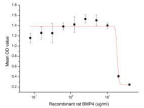 BMP4 (Bone morphogenetic protein 4) is a member of the bone morphogenetic protein family, which is involved in bone and cartilage development, specifically tooth and limb development and fracture repair. To test the effect of BMP4 on cell apoptosis, HepG2 cells were seeded into triplicate wells of 96-well plates at a density of 4,000 cells/well and allowed to attach overnight, then the medium was replaced with various concentrations of recombinant rat BMP4 diluted with 5% serum standard DMEM. After incubated for 72h, cells were observed by inverted microscope and cell proliferation was measured by Cell Counting Kit-8 (CCK-8). Briefly, 10 µl of CCK-8 solution was added to each well of the plate, then the absorbance at 450 nm was measured using a microplate reader after incubating the plate for 1-4 hours at 37°C. Apoptosis of HepG2 cells after incubation with BMP4 for 72h observed by inverted microscope was shown. Cell viability was assessed by CCK-8 (Cell Counting Kit-8 ) assay after incubation with recombinant rat BMP4 for 72h. BMP4 significantly decreased cell viability of HepG2 cells. The ED50 of recombinant rat BMP4 is 18.5 ug/ml. |