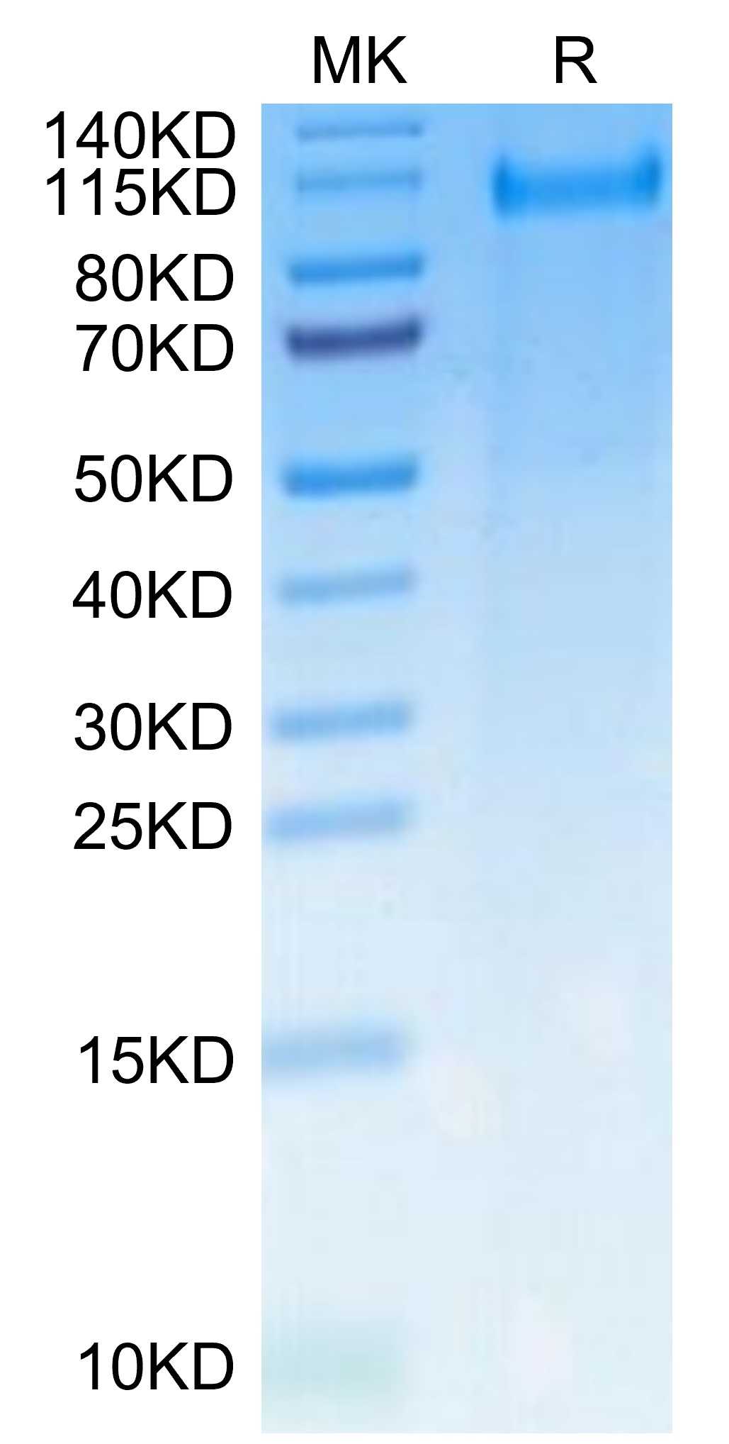 | Molecular Mass : | The protein has a predicted MW of 73.09 kDa. Due to glycosylation, the protein migrates to 90-115 kDa based on Tris-Bis PAGE result. |