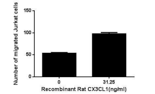 Chemokine C-X3-C-Motif Ligand 1 (CX3CL1) also known as fractalkine is a large cytokine protein of 373 amino acids, it contains multiple domains and is the only known member of the CX3C chemokine family. Soluble CX3CL1 potently chemoattracts T cells and monocytes, while the cell-bound chemokine promotes strong adhesion of leukocytes to activated endothelial cells, where it is primarily expressed.Thus, chemotaxis assay used 24-well microchemotaxis system was undertaken to detect the chemotactic effect of CX3CL1 on the human monocytic cell line THP-1. Briefly, THP-1 cells were seeded into the upper chambers (150uL cell suspension, 10^6 cells/mL in RPMI 1640 with FBS free) and SLC (15.625ng/mL, 31.25ng/mL, 62.5ng/mL and 125ng/mL diluted separately in serum free RPMI 1640) was added in lower chamber with a polycarbonate filter (8um pore size) used to separate the two compartments. After incubation at 37°C with 5% CO2 for 1h, the filter was removed, then cells in low chamber were observed by inverted microscope at low magnification (×100) and the number of migrated cells were counted at high magnification (×400) randomly (five fields for each filter). Result shows CX3CL1 is able to induce migration of THP-1 cells. The migrated Jurkat cells in low chamber at low magnification (×100) were shown. Five fields of each chamber were randomly chosen, and the migrated cells were counted at high magnification (×400). The optimum chemotaxis of CX3CL1 occurs at 15.625-125ng/mL.