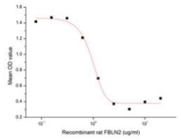 Fibulin 2 (FBLN2) is the second largest member of the seven-member fibulin family of extracellular membrane (ECM) glycoproteins. The protein is known to form disulfide-linked homodimers, but it can also be secreted as an oligomer. Fibulin 2 is considered a multifunctional binding protein due to its association with numerous ECM components, but its specific interactions have yet to be determined. Fibulin 2 is localized at the interface between microfibrils and the elastin core and its known interactions include nidogen-1, perlecan, laminin, aggrecan, endostatins, versican, collagen, and tropoelastin. It is down-regulated in numerous forms of cancer including breast, colorectal, lung, esophageal, and squamous cell carcinoma, but over-expression has been shown with solid tumors. To test the effect of FBLN2 on cell apoptosis, A549 cells were seeded into triplicate wells of 96-well plates at a density of 4,000 cells/well and allowed to attach overnight, then the medium was replaced with various concentrations of recombinant rat FBLN2 diluted with 5% serum standard DMEM. After incubated for 72h, cells were observed by inverted microscope and cell proliferation was measured by Cell Counting Kit-8 (CCK-8). Briefly, 10 µl of CCK-8 solution was added to each well of the plate, then the absorbance at 450 nm was measured using a microplate reader after incubating the plate for 1h at 37°C. Proliferation of A549 cells after incubation with FBLN2 for 72h observed by inverted microscope was shown. Cell viability was assessed by CCK-8 (Cell Counting Kit-8 ) assay after incubation with recombinant rat FBLN2 for 72h. The result was shown. It was obvious that FBLN2 significantly inhibit cell viability of A549 cells. The ED50 is 0.97 μg/mL. |