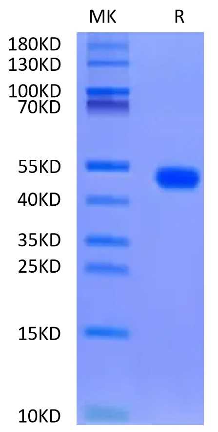 | Molecular Mass : | The protein has a predicted MW of 31.31 kDa. Due to glycosylation, the protein migrates to 45-55 kDa based on Tris-Bis PAGE result. |