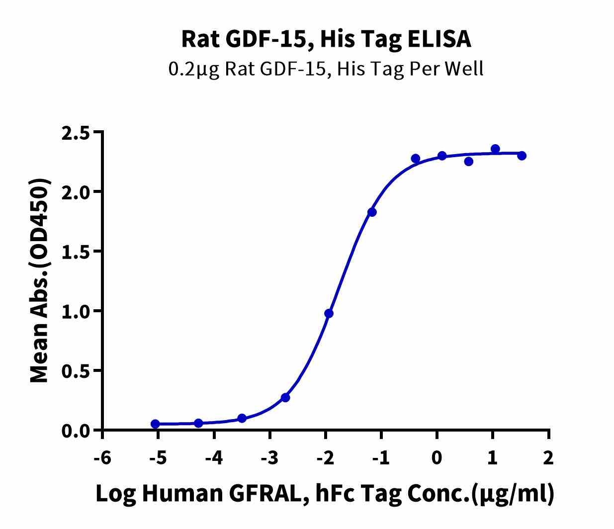 | Bio-activity : | Immobilized Rat GDF-15, His Tag at 2μg/ml (100μl/well) on the plate. Dose response curve for Human GFRAL, hFc Tag with the EC50 of 17.2ng/ml determined by ELISA. |