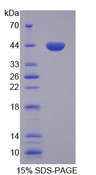 43kDa as determined by SDS-PAGE reducing conditions. |