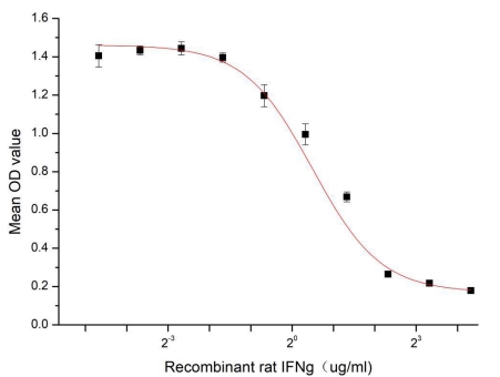 IFN-γ is a dimerized soluble cytokine that is the only member of the type II class of interferons.The importance of IFNγ in the immune system stems in part from its ability to inhibit viral replication directly, and most importantly from its immunostimulatory and immunomodulatory effects. As reported, IFNγ is an important activator of lymphocytes. Therefore, EL4 cells were seeded into 96-well plates at a density of 8,000 cells/well with 5% serum standard DMEM including various concentrations of recombinant rat IFN-γ. After incubated for 72h, cells were observed by inverted microscope and cell proliferation was measured by Cell Counting Kit-8 (CCK-8). Briefly, 10 µl of CCK-8 solution was added to each well of the plate, then the absorbance at 450 nm was measured using a microplate reader after incubating the plate for 2 hours at 37°C. Cell viability was assessed by CCK-8 (Cell Counting Kit-8 ) assay after incubation with recombinant rat IFN-γ for 72h. The result was shown. It was obvious that IFN-γ significantly inhibit cell viability of EL4 cells. The ED50 is 1.41μg/mL. |