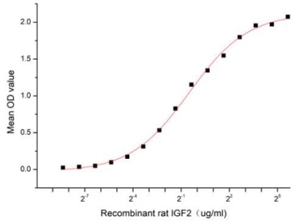 Insulin-like growth factor 2 (IGF2) is one of three protein hormones that share structural similarity to insulin. It has growth-regulating, insulin-like and mitogenic activities.IGF2 exerts its effects by binding to the IGF-1 receptor and to the short isoform of the insulin receptor. IGF2 may also bind to the IGF2 receptor (also called the cation-independent mannose 6-phosphate receptor), which acts as a signalling antagonist; that is, to prevent IGF2 responses. Besides, Insulin Receptor (INSR) has been identified as an interactor of IGF2, thus a functional binding ELISA assay was conducted to detect the interaction of recombinant rat IGF2 and recombinant human INSR. Briefly, IGF2 were diluted serially in PBS, with 0.01% BSA (pH 7.4). Duplicate samples of 100 ul were then transferred to INSR-coated microtiter wells and incubated for 2h at 37°C. Wells were washed with PBST and incubated for 1h with anti-IGF2 pAb, then aspirated and washed 3 times. After incubation with HRP labelled secondary antibody, wells were aspirated and washed 5 times. With the addition of substrate solution, wells were incubated 15-25 minutes at 37°C. Finally, add 50µL stop solution to the wells and read at 450 nm immediately. The binding activity of recombinant rat IGF2 and recombinant human INSR was shown, the EC50 for this effect is 0.71 ug/mL. |