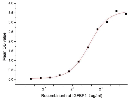 Insulin Like Growth Factor Binding Protein 1 (IGFBP1) is a member of the IGFBP family that binds to insulin-like growth factors (IGFs) with high affinity. IGFBP1 plays a crucial role in regulating the biological activities of IGFs, which are important for growth and development. IGFBP1 is primarily produced in the liver and is also secreted by various other tissues, including the decidua of the uterus during pregnancy. Its levels in the bloodstream are influenced by factors such as nutritional status, insulin levels, and growth hormone. To detect the activity of recombinant GFBP1,a functional ELISA assay was conducted to detect the interaction of recombinant rat IGFBP1 and recombinant human Insulin Like Growth Factor 1 (IGF1). Briefly, IGFBP1 was diluted serially in PBS with 0.01% BSA (pH 7.4). Duplicate samples of 100 μl were then transferred to IGF1-coated microtiter wells and incubated for 1h at 37°C. Wells were washed with PBST and incubated for 1h with anti-IGFBP1 pAb, then aspirated and washed 3 times. After incubation with HRP labelled secondary antibody for 1h at 37°C, wells were aspirated and washed 5 times. With the addition of substrate solution, wells were incubated 15-25 minutes at 37°C. Finally, add 50 µL stop solution to the wells and read at 450/630nm immediately. The binding activity of recombinant rat IGFBP1 and recombinant human IGF1 was shown, the EC50 for this effect is 0.222ug/mL. |