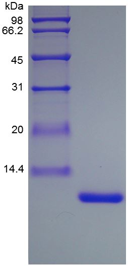Interleukin-13 (IL-13) is expressed by the IL13 gene and secreted by many cell types, especially T helper type 2 (Th2) cells. The high solution from of IL-13 reported to be a monomer with two internal disulfide bonds that contribute to a bundled four α-helix configuration. Targeted deletion of IL-13 in mice resulted in impaired Th2 cell development and indicated an important role for IL-13 in the expulsion of gastrointestinal parasites. IL-13 exerts anti-inflammatory effects on monocytes and macrophages and it inhibits the expression of inflammatory cytokines such as IL-1beta, TNF-alpha, IL-6 and IL-8. IL-13 has also been shown to enhance B cell proliferation and to induce isotype switching resulting in increased production of IgE. Mature rat IL-13 shares 59 %, 75 %, and 60 % amino acid sequence identity with human, mouse, and rhesus IL-13, respectively. |