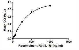 IL1R1 (Interleukin 1 Receptor Type I), also known as CD121a, is an important mediator involved in many cytokine induced immune and inflammatory responses. It belongs to the interleukin-1 receptor family, and is a receptor for interleukin 1 alpha (IL1A), interleukin 1 beta (IL1B), and interleukin 1 receptor antagonist (IL1RA). Besides, mouse IL1B shares 87.0% AA sequence identity with rat IL1B, suggesting the exist of cross-species activity. Thus, a binding ELISA assay was constructed to detect the association of recombinant rat IL1R1 with recombinant mouse IL1B. Briefly, IL1R1 were diluted serially in PBS with 0.1%BSA (pH 7.4). Duplicate samples of 100uL were then transferred to IL1B-coated microtiter wells and incubated for 2h at 37°C. Wells were washed with PBST and incubated for 1h with anti-IL1R1 pAb, then aspirated and washed 3 times. After incubation with HRP labelled secondary antibody, wells were aspirated and washed 3 times. With the addition of substrate solution, wells were incubated 15-25 minutes at 37°C. Finally, add 50µL stop solution to the wells and read at 450nm immediately. The binding activity of IL1R1 with IL1B was shown and this effect was in a dose dependent manner. |
