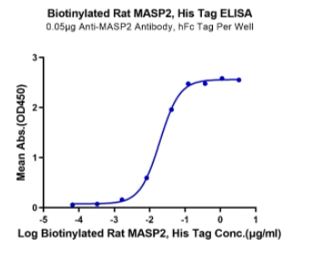 | Bio-activity : | Immobilized Anti-MASP2 Antibody, hFc Tag at 0.5ug/ml (100ul/well) on the plate. Dose response curve for Biotinylated Rat MASP2, His Tag with the EC50 of 19.3ng/ml determined by ELISA. |