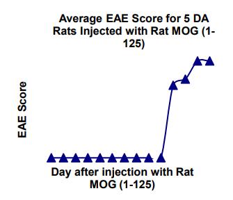 | Bio-activity : | Female DA rats and Lewis rats (7-9 weeks old) were immunized (tail base s.c.) with 50-75 μg/animal of rat rMOG in complete Freund's adjuvant. DA and Lewis rats showed EAE symptoms such as limp tail, hind limb weakness, hind limb paralysis, and weight loss after induction. Please note that no other EAE induction protocols were tested including IFA/cytokine model. |