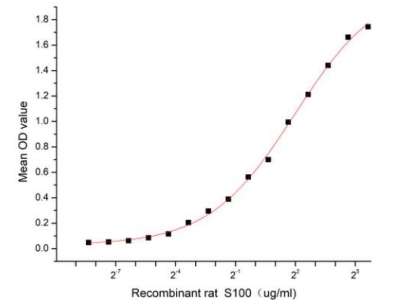 | Bio-activity : | Small calcium binding protein that S100 Calcium Binding Protein (S100), also known as S100 Alpha (S100A1), is a member of the S100 family of calcium-binding proteins. As with most S100 proteins, S100A1 proteins are localized in the cytoplasm and/or nucleus of a wide range of cells, and it possess a variety of intracellular and extracellular functions. They interact with multiple receptors and signal transducers to regulate pathways that govern inflammation, cell differentiation, proliferation, energy metabolism, apoptosis, calcium homeostasis, cell cytoskeleton and microbial resistance. S100 Calcium Binding Protein A4 (S100A4) is one of targets of S100A1. Thus a functional binding ELISA assay was conducted to detect the interaction of recombinant rat S100A1 and recombinant mouse S100A4. Briefly, S100A1 was diluted serially in PBS with 0.01% BSA (pH 7.4). Duplicate samples of 100 μl were then transferred to S100A4-coated microtiter wells and incubated for 1h at 37°C. Wells were washed with PBST and incubated for 1h with anti-S100A1 pAb, then aspirated and washed 3 times. After incubation with HRP labelled secondary antibody for 1h at 37°C, wells were aspirated and washed 5 times. With the addition of substrate solution, wells were incubated 15-25 minutes at 37°C. Finally, add 50 µL stop solution to the wells and read at 450/630 nm immediately. The binding activity of recombinant rat S100A1 and recombinant mouse S100A4 was shown, the EC50 for this effect is 3.92 ug/mL. |
