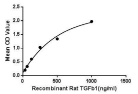 Transforming Growth Factor Beta 1 (TGFb1) is a multifunctional set of peptidesthat controls proliferation, differentiation, and other functions in manycell types. TGF beta 1 has been shown to interact with TGF beta receptor 1, Decorin, LTBP1 and so on. Besides, Latent Transforming Growth Factor Beta Binding Protein 1 (LTBP1) has been identified as an interactor of TGFb1, thus a binding ELISA assay was conducted to detect the interaction of recombinant rat TGFb1 and recombinant mouse LTBP1 (high homology with rat). Briefly, TGFb1 were diluted serially in PBS, with 0.01% BSA (pH 7.4). Duplicate samples of 100uLwere then transferred to LTBP1-coated microtiter wells and incubatedfor 2h at 37°C. Wells were washed with PBST and incubated for 1h with anti-TGFb1pAb, then aspirated and washed 3 times. After incubation with HRP labelled secondary antibody, wells were aspirated and washed 3 times. With the addition of substrate solution, wells were incubated 15-25 minutes at 37°C. Finally, add 50µL stop solution to the wells and read at 450nm immediately. The binding activity of TGFb1 and LTBP1 was shown, and this effect was in a dose dependent manner. |