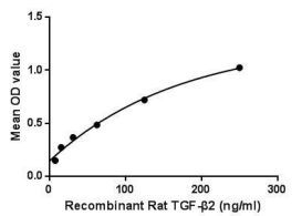 Transforming growth factor-beta 2 (TGF-β2) is a secreted protein known as a cytokine that performs many cellular functions and has a vital role during embryonic development (alternative names: Glioblastoma-derived T-cell suppressor factor, G-TSF, BSC-1 cell growth inhibitor, Polyergin, Cetermin). It is an extracellular glycosylated protein. It is known to suppress the effects of interleukin dependent T-cell tumors. Besides, Vitronectin (VTN) has been identified as an interactor of TGF-β2, thus a binding ELISA assay was conducted to detect the interaction of recombinant rat TGF-β2 and recombinant rat VTN. Briefly, TGF-β2 were diluted serially in PBS, with 0.01% BSA (pH 7.4). Duplicate samples of 100μL were then transferred to VTN-coated microtiter wells and incubated for 2h at 37°C. Wells were washed with PBST and incubated for 1h with anti-TGF-β2 pAb, then aspirated and washed 3 times. After incubation with HRP labelled secondary antibody, wells were aspirated and washed 3 times. With the addition of substrate solution, wells were incubated 15-25 minutes at 37°C. Finally, add 50µL stop solution to the wells and read at 450nm immediately. The binding activity of TGF-β2 and VTN was shown, and this effect was in a dose dependent manner. |