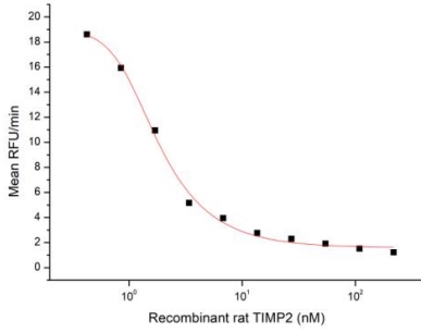 | Bio-activity : | Tissue inhibitors of metalloproteinases or TIMPs are a family of proteins that regulate the activation and proteolytic activity of the zinc enzymes known as matrix metalloproteinases (MMPs). There are four members of the family, TIMP-1, TIMP-2, TIMP-3, and TIMP-4. TIMP-2 is a non N-glycosylated protein with a molecular mass of 22 kDa produced by a wide range of cell types, which inhibits MMPs non-covalently by the formation of binary complexes. TIMP-2 also has erythroidpotentiating and cell growth promoting activities. The activity of recombinant rat TIMP2 was measured by its ability to inhibit rhMMP2 cleavage of a fluorogenic peptide substrate MCA-Pro-Leu-Gly-Leu-DPA-Ala-Arg-NH2 in the assay buffer 50 mM Tris, 10 mM CaCl2, 150 mM NaCl, 0.05% (w/v) Brij-35, pH 7.5. rhMMP2 was diluted to 100 ug/ml and activated with 1 mM APMA at 37°C for 1 hour and rrTIMP2 (MW: 22.98 KD) was diluted to different concentrations with the assay buffer. Mix 8 µl of rrTIMP2 curve dilutions, 12.8 µl of activated rhMMP-2, and 59.2 µl of assay buffer, including a control containing assay buffer and the diluted rhMMP-2 and incubate the reactions for 2 hours at 37°C. Loading 50 µl of the incubated mixtures which were diluted five-fold in assay buffer into empty wells of a plate, and start the reaction by adding 50 µl of 20 µM substrate. Include a substrate blank containing 50 µl of assay buffer and 50 µl of 20 µM substrate. Then read at excitiation and emission wavelengths of 320 nm and 405 nm, respectively, in kinetic mode for 5 minutes. The result was shown and it was obvious that recombinant rat TIMP2 significantly decreased rhMMP2 activity. The inhibition IC50 was <1.7 nM. |