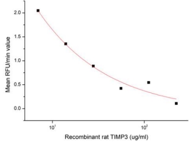 Tissue Inhibitors Of Metalloproteinase 3 (TIMP3) is an protein belongs to the tissue inhibitor of metalloproteinases family. They are inhibitors of the matrix metalloproteinases. TIMP-3 is the only member of the TIMP family which is found exclusively in the extracellular matrix (ECM). It is regulated in a cell cycle-dependent fashion in certain cell types and may serve as a marker for terminal differentiation. Besides, Matrix Metalloproteinase 2 (MMP2) has been identified as an interactor of TIMP3, thus a binding ELISA assay was conducted to detect the interaction of recombinant rat TIMP3 and recombinant rat MMP2. Briefly, TIMP3 were diluted serially in PBS, with 0.01% BSA (pH 7.4). Duplicate samples of 100µL were then transferred to MMP2-coated microtiter wells and incubated for 2h at 37°C. Wells were washed with PBST and incubated for 1h with anti-TIMP3 pAb, then aspirated and washed 3 times. After incubation with HRP labelled secondary antibody, wells were aspirated and washed 3 times. With the addition of substrate solution, wells were incubated 15-25 minutes at 37°C. Finally, add 50µL stop solution to the wells and read at 450nm immediately. The binding activity of TIMP3 and MMP2 was shown, and this effect was in a dose dependent manner. |