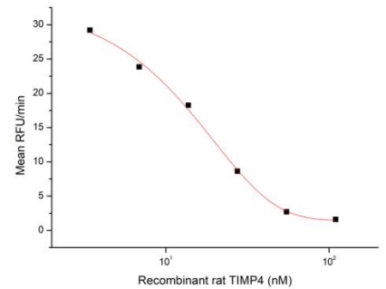 Tissue Inhibitors of Metalloproteinase 4 (TIMP4) is an enzyme that in humans is encoded by the TIMP4 gene. This gene belongs to the tissue inhibitor of metalloproteinases gene family. The proteins encoded by this gene family are inhibitors of the matrix metalloproteinases, a group of peptidases involved in degradation of the extracellular matrix. The secreted, netrin domain-containing protein encoded by this gene is involved in regulation of platelet aggregation and recruitment and may play role in hormonal regulation and endometrial tissue remodeling. The activity of recombinant rat TIMP4 was measured by its ability to inhibit rhMMP2 cleavage of a fluorogenic peptide substrate MCA-Pro-Leu-Gly-Leu-DPA-Ala-Arg-NH2 in the assay buffer 50 mM Tris, 10 mM CaCl2, 150 mM NaCl, 0.05% (w/v) Brij-35, pH 7.5. rhMMP2 was diluted to 100 ug/ml and activated with 1 mM APMA at 37°C for 1 hour and rrTIMP4 (MW: 22.79 KD) was diluted to different concentrations with the assay buffer. Mix 8 µl of rrTIMP4 curve dilutions, 12.8 µl of activated rhMMP-2, and 59.2 µl of assay buffer, including a control containing assay buffer and the diluted rhMMP-2 and incubate the reactions for 2 hours at 37°C. Loading 50 µl of the incubated mixtures which were diluted five-fold in assay buffer into empty wells of a plate, and start the reaction by adding 50 µl of 20 µM substrate. Include a substrate blank containing 50 µl of assay buffer and 50 µl of 20 µM substrate. Then read at excitiation and emission wavelengths of 320 nm and 405 nm, respectively, in kinetic mode for 5 minutes. The result was shown and it was obvious that recombinant rat TIMP4 significantly decreased rhMMP2 activity. The inhibition IC50 was <14 nM. |