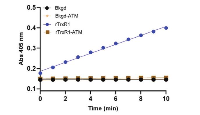 One unit is defined as the NADPH-dependent production of 2 mmol of 2-nitro-5-thiobenzoate per minute at 22 centigrade in 50 mM potassium phosphate, pH 7.0, with 50 mM potassium chloride, 1 mM EDTA, and 0.2 mg/mL BSA. For inhibition, the selective TrxR1 inhibitor sodium aurothiomalate (ATM) was used at a concentration of 20 mM. |
