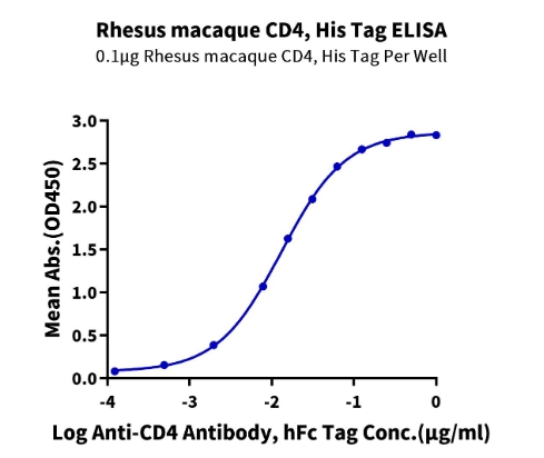 Immobilized Rhesus macaque CD4, His Tag at 1 μg/ml (100 μl/Well) on the plate. Dose response curve for Anti-CD4 Antibody, hFc Tag with the EC50 of 13.0 ng/ml determined by ELISA. |