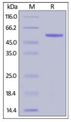 Molecular Mass : | The protein has a calculated MW of 51.0 kDa. The protein migrates as 53 kDa under reducing (R) condition (SDS-PAGE) due to glycosylation. |