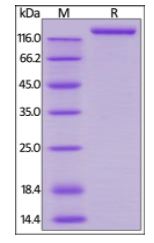 | Molecular Mass : | The protein has a calculated MW of 109.1 kDa. The protein migrates as 130 kDa under reducing (R) condition (SDS-PAGE) due to glycosylation. |