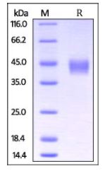Molecular Mass : | The protein has a calculated MW of 31.1 kDa. The protein migrates as 41-45 kDa under reducing (R) condition (SDS-PAGE) due to glycosylation. |