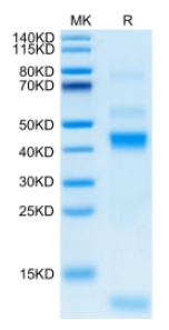 Molecular Mass : | The protein has a predicted MW of 31.4/12.8 kDa. Due to glycosylation, the protein migrates to 40-50/14-15 kDa based on Tris-Bis PAGE result. |