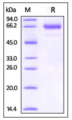Molecular Mass : | The protein has a calculated MW of 46.9 kDa. The protein migrates as 66-70 kDa under reducing (R) condition (SDS-PAGE). |
