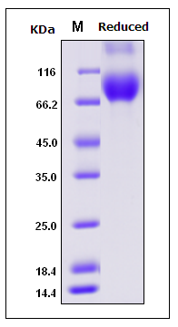The recombinant human FLT3 has a predicted molecular mass of 59.7 kDa. In SDS-PAGE under reducing conditions, it migrates with an apparent molecular mass of 85-95 kDa due to glycosylation. |