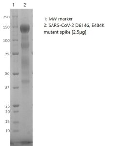 | Product Overview : | SARS-CoV-2 D614G, E484K mutant spike subunit 1 contains Spike protein 1-674, C-terminally tagged with sheep Fc was manufactured in HEK293 cells and purified from culture supernatant by Protein G chromatography. |