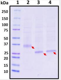| Molecular Mass : | Recombinant protein product has a calculated molecular mass of ∼25 kDa. Due to the abundant glycosylation, it migrates as approximately ∼30 kDa protein bands in SDS-PAGE under DTT, beta-mercaptoethanol reducing conditions. After deglycosylation under native and denature conditions, the protein presented as one reduced ∼25 kDa band. |