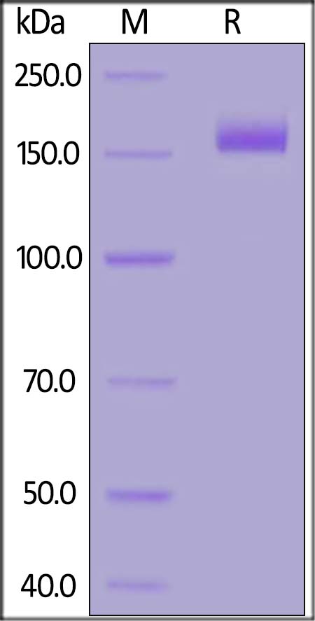 | Molecular Mass : | The protein has a calculated MW of 139.7 kDa. The protein migrates as 150-200 kDa under reducing (R) condition (SDS-PAGE) due to glycosylation. |