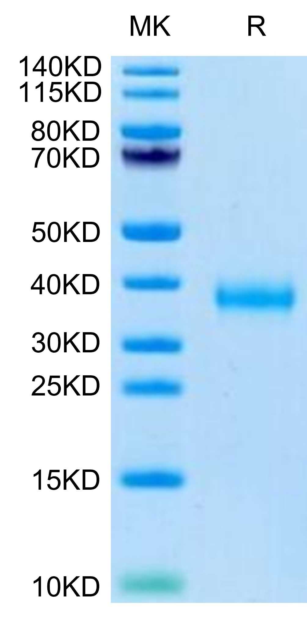 | Molecular Mass : | The protein has a predicted MW of 26.26 kDa. Due to glycosylation, the protein migrates to 35-40 kDa based on Tris-Bis PAGE result. |
