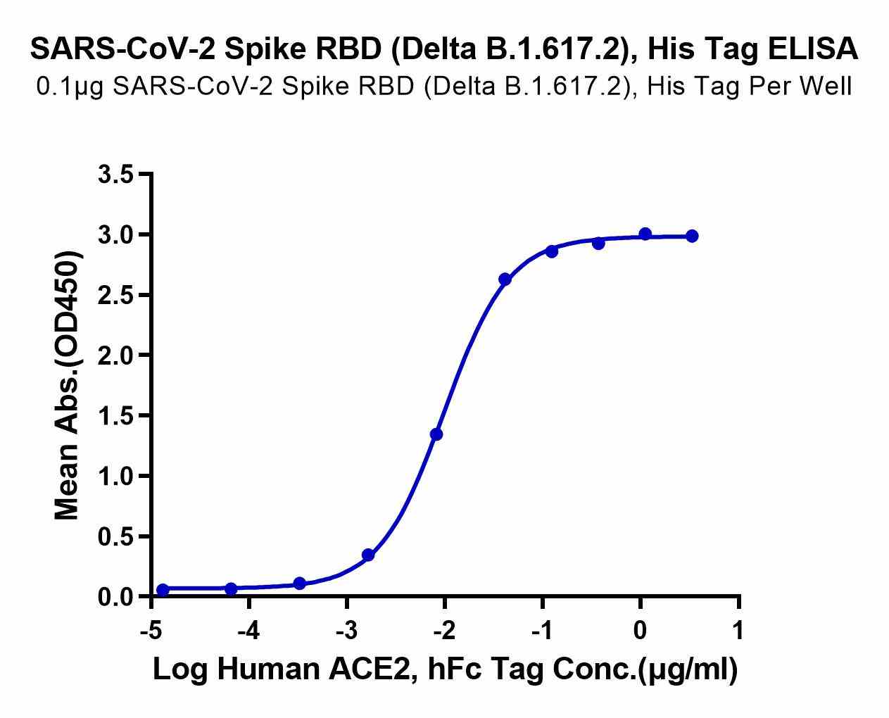 | Bio-activity : | Immobilized SARS-CoV-2 Spike RBD (Delta B.1.617.2), His Tag at 1μg/ml (100μl/well) on the plate. Dose response curve for Human ACE2, hFc Tag with the EC50 of 9.8ng/ml determined by ELISA. |
