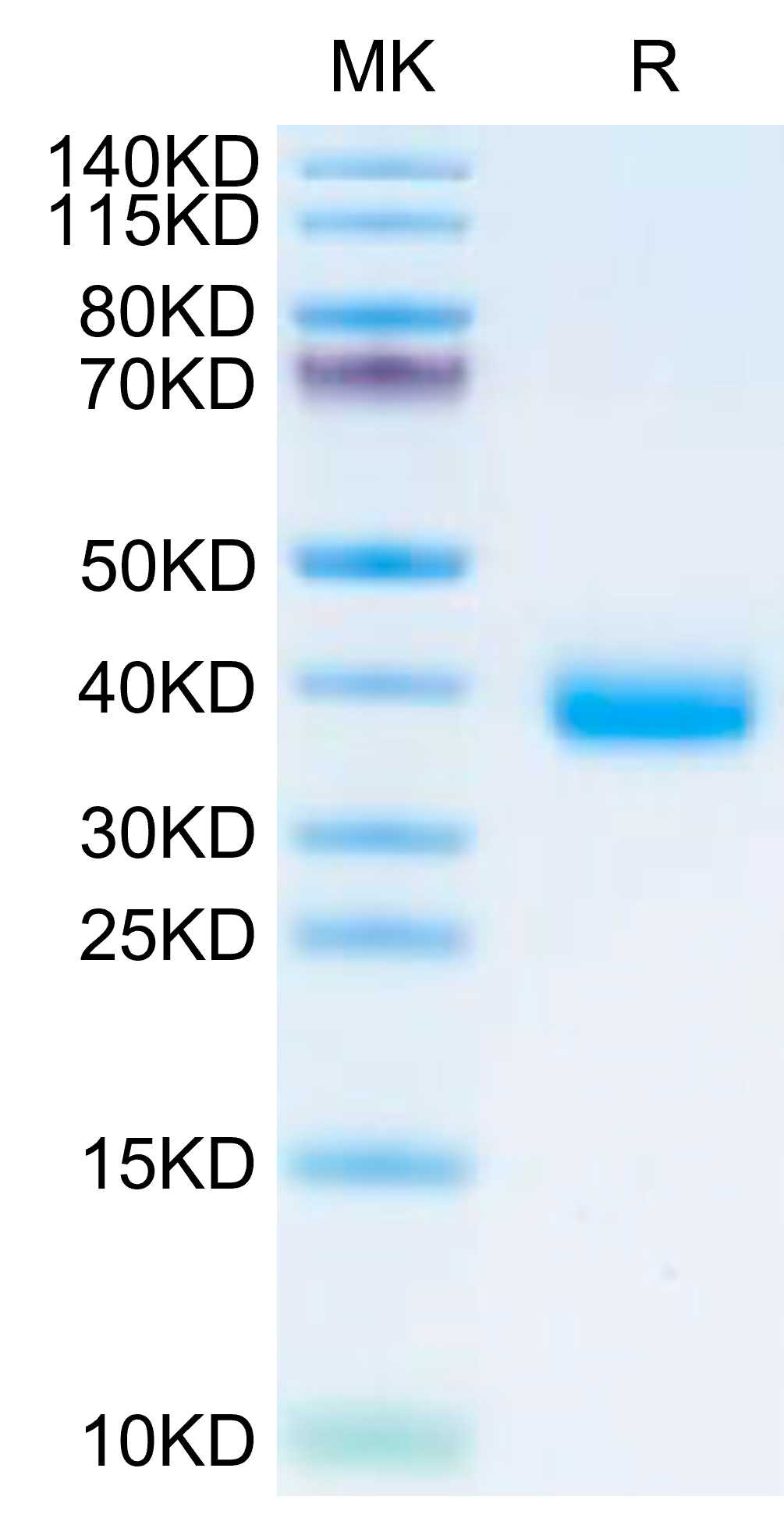| Molecular Mass : | The protein has a predicted MW of 26.28 kDa. Due to glycosylation, the protein migrates to 35-43 kDa based on Tris-Bis PAGE result. |